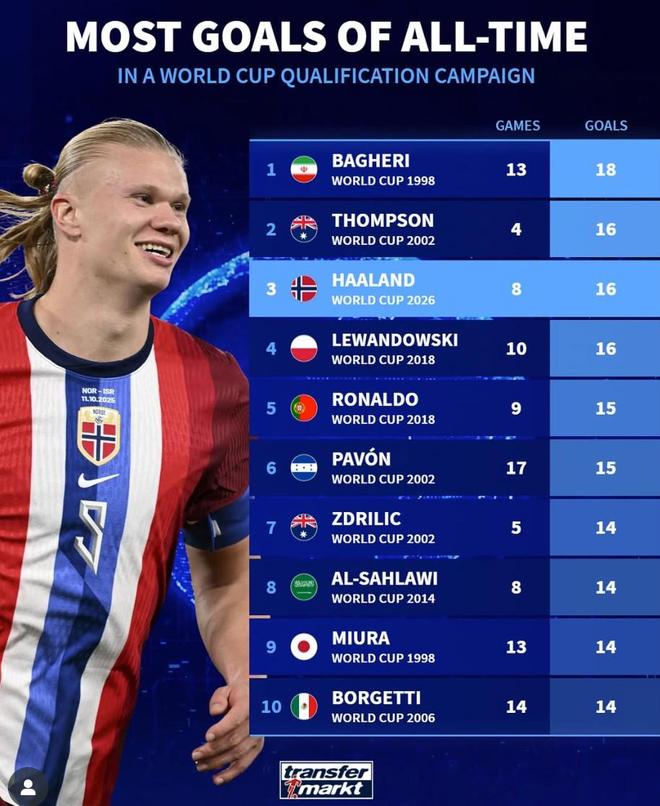 北京时间11月18日,在挪威以八胜击败意大利,直接晋级美国、加拿大和墨西哥世界杯后,德胡安盘点了世界杯预选赛历史上单场进球数最多的10名球员。哈兰德在本届世界杯上8场比赛打入16球排名第三,莱万多夫斯基以10场比赛16球排名第四,C罗以9场比赛15球排名第五。根据德国转会统计,世界杯预选赛单场进球前十名: 1. 巴盖里(伊朗) 1998 年世界杯预选赛 18 球(13 场) 2. 阿奇·汤普森(澳大利亚)2002 年世界杯预选赛 16 球(4 场) 3. 哈兰德(挪威)2026 年世界杯预选赛 16 球(8 场) 4. 莱万多夫斯基(波兰) 2018 年世界杯预选赛 16 球(10 场) 5. 克里斯蒂亚诺·罗纳尔多(葡萄牙) 2018 世界杯预选赛 15 球(9 场) 6. 卡洛斯·帕文(洪都拉斯) 2002 年世界杯预选赛 15 球(17 场) 7. 兹德里奇(澳大利亚) 2002 年世界杯赛预选赛 14 球(5 场比赛) 8. 穆罕默德·撒哈拉维(沙特阿拉伯) 2014 年世界杯预选赛 14 球(8 场比赛) 9. 三浦知世(日本) 1998 年世界杯预选赛 14 球(13 场比赛) 10. 博尔盖蒂(墨西哥)2006 年世界杯预选赛 14 球(14 场比赛) 注:阿奇·汤普森进球2001年4月11日,在大洋洲世界杯预选赛中,澳大利亚队以一场比赛13个进球以31-0击败美属萨摩亚队。兹德里奇在一场比赛中攻入8球。 【咪咕独家观看英超联赛】