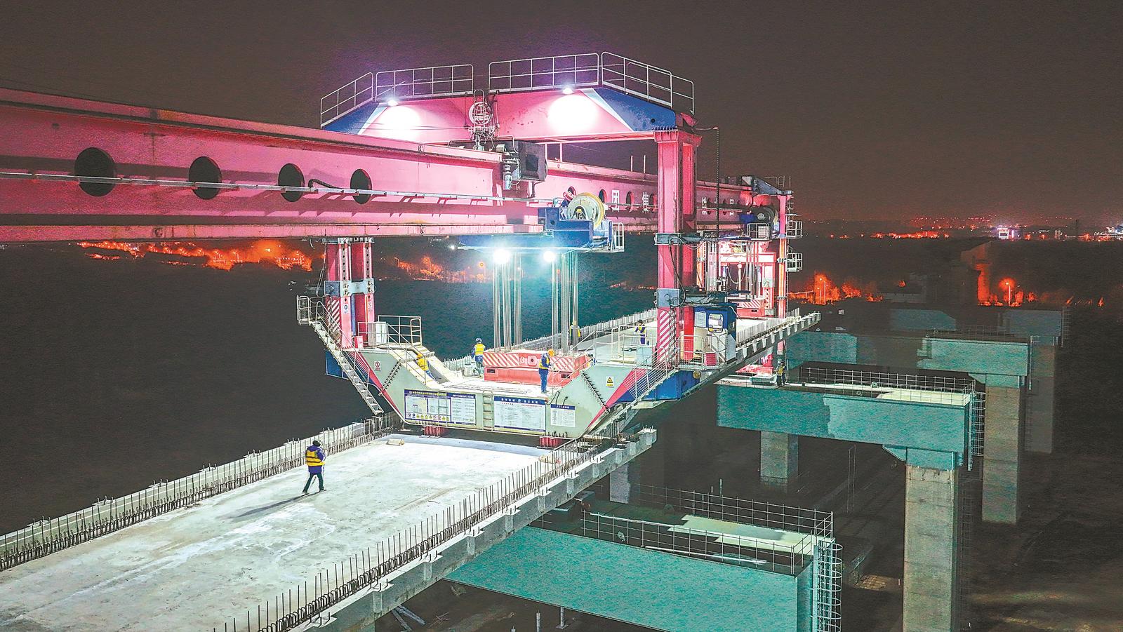 12月9日凌晨,沪宁合高铁在合肥枢纽建设工地开通。经过两个小时的连续施工,架梁作业顺利完成。沪宁合高铁建成后,将成为上海都市圈、南京都市圈、合肥都市圈之间的快速新通道。对于打造“轨道上的长三角”、推动长三角一体化高质量发展具有重要意义。通讯员 张敏 摄